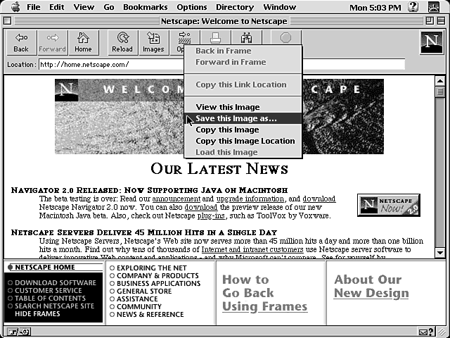 Next, select an individual graphics file on the page, and save it to your hard drive. In Windows 95, right-click a graphic and then choose to save the graphic as a file (in Navigator or Internet Explorer). On a Mac, hold down the mouse button and then choose to save the graphic when the pop-up menu appears (see . 9.1).
