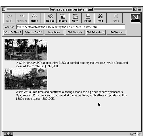 At the same time, you could use a definition list in conjunction with thumbnail graphics in a list that uses both the <DT> and <DD> tags. An example might be the following real estate agent's pages (see fig. 9.12):