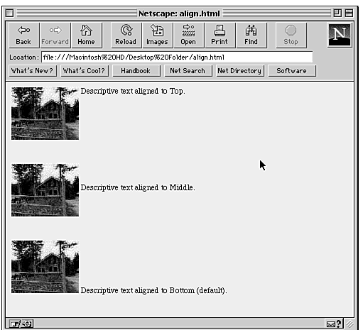 <IMG> can accept another attribute that specifies how graphics appear relative to other elements (like text or other graphics). Using the ALIGN attribute, you can align other elements to the top, middle, or bottom of the graphic. It follows this format: