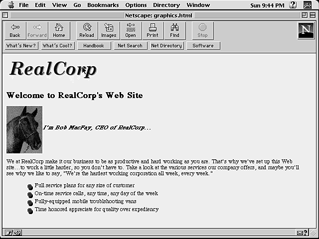 For the photo of the CEO, the <IMG> tag is called within the <H2> tag, because the <H2> container (like a paragraph) otherwise would insert a carriage return and force the words I'm Bob MacFay... to appear below the photo. Including the <IMG> tag inside the <H2> tag allows the text to appear next to the photo (see fig. 9.14).